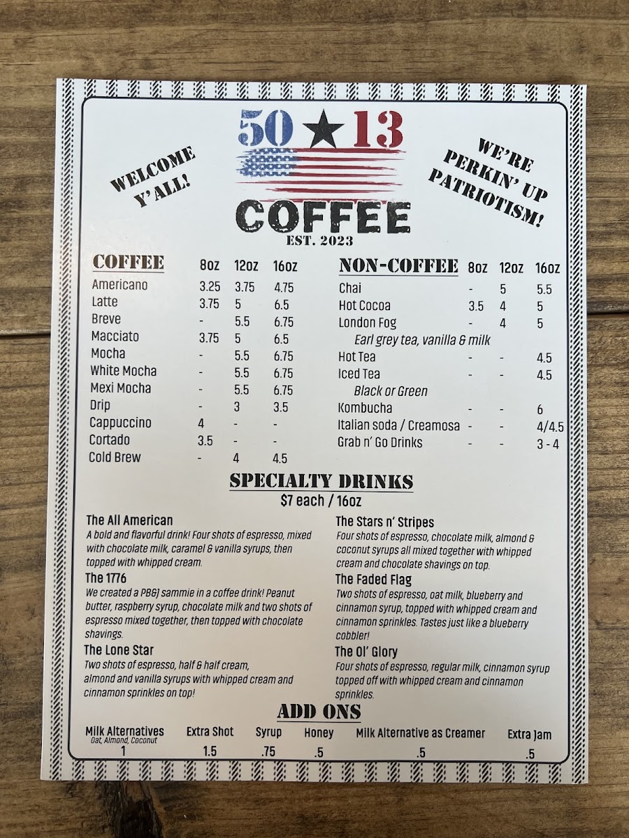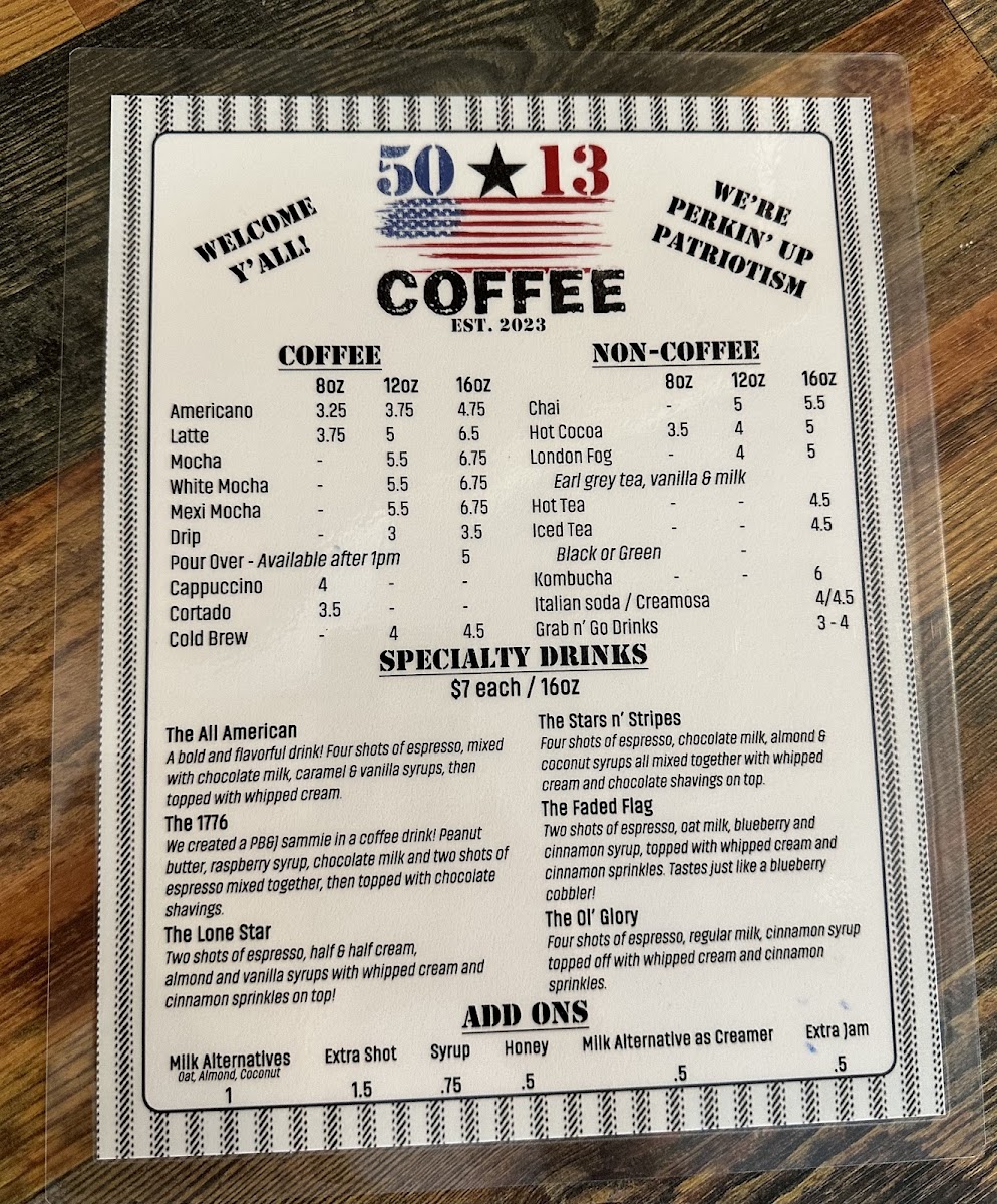 The menu at 5013 Coffee Heath offers a delightful range of beverages, both hot and cold, perfect for any time of day. For those looking for a refreshing treat, the Summer Specials are a must-try, with options like The Rwb, The 4th of July, The Oh My Peaches, and The Strawberry Fields, each offering a unique, seasonal twist. If you prefer something more classic, their Coffee selection is sure to satisfy, featuring favorites like Americano, Latte, Mocha, White Mocha, and the indulgent Mexi Mocha. For those looking to customize their drinks, milk alternatives are available as an add-on. The Non-Coffee section also has options for those who enjoy a warm, comforting drink, including Chai, Hot Cocoa, and London Fog, along with an assortment of Hot Tea and Grab N' Go Drinks. Whether you're in the mood for something sweet and fruity or a classic coffee beverage, 5013 Coffee Heath has something to offer for every palate.